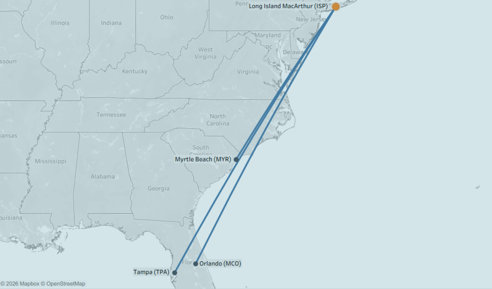 Fly nonstop to Fort Lauderdale, Fort Myers, Myrtle Beach, Orlando, Palm Beach and Tampa.